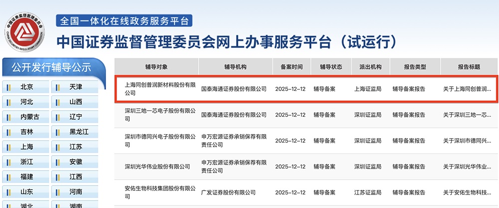 芯东西12月15日报道,12月11日,证监会官网披露,上海半导体超高纯金属材料供应商同创普润在上海证监局办理上市辅导备案登记,启动IPO进程,辅导机构为国泰海通。
