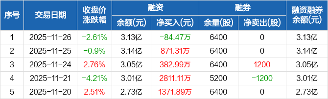 融资方面,当日融资买入2647.19万元,融资偿还2731.66万元,融资净偿还84.47万元。融券方面,融券卖出0股,融券偿还0股,融券余量6400股,融券余额6.21万元。融资融券余额合计3.13亿元。