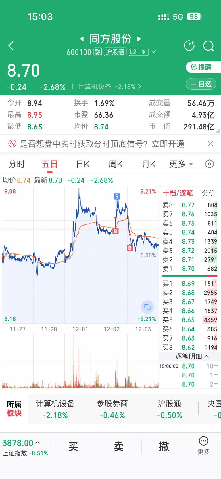 同方依然没有起色,不担心,没有破位,继续拿着