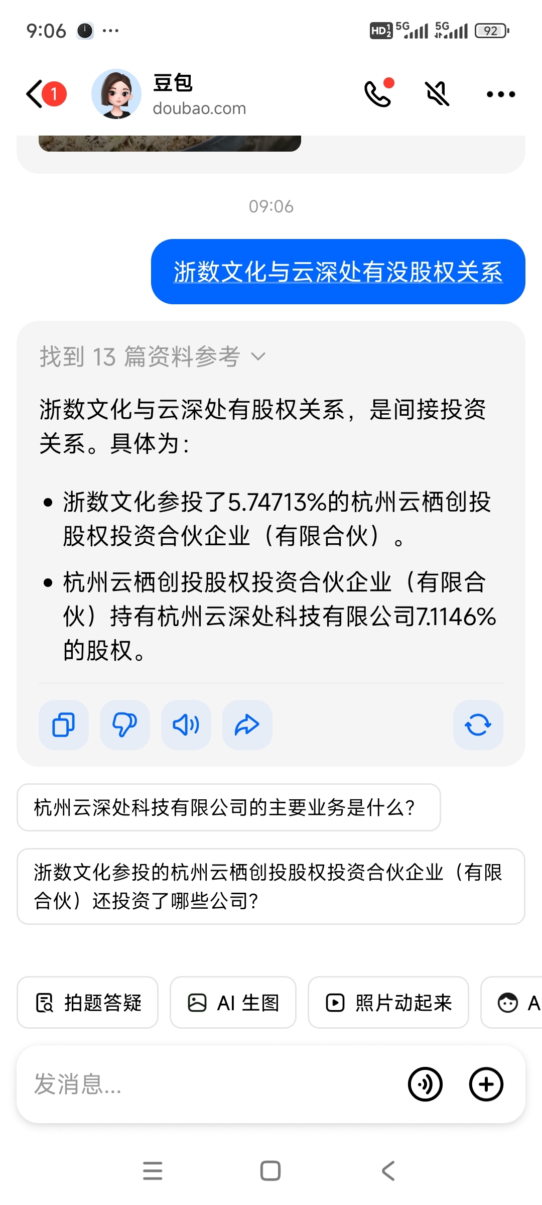 $浙数文化(SH600633)$ 问豆包:浙数文化与云深处有没股权关系?