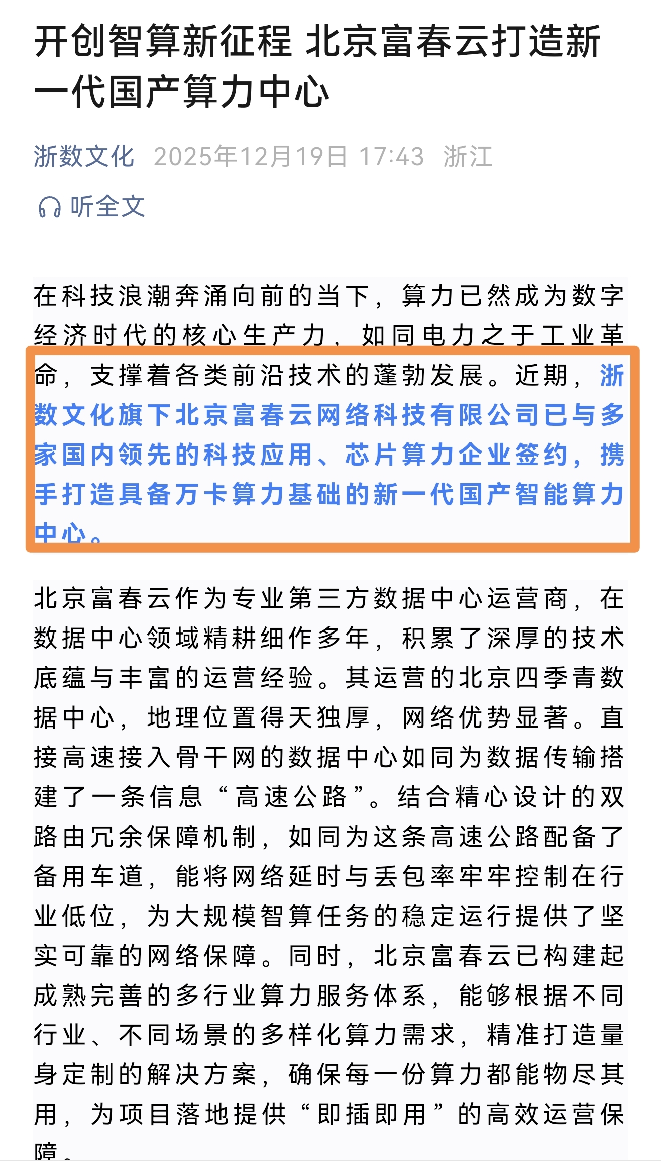 $浙数文化(SH600633)$ 北京富春云,和多家国内领先芯片企业签约?还是万卡算力中心,不会这么巧,是和摩尔,沐曦合作吧
