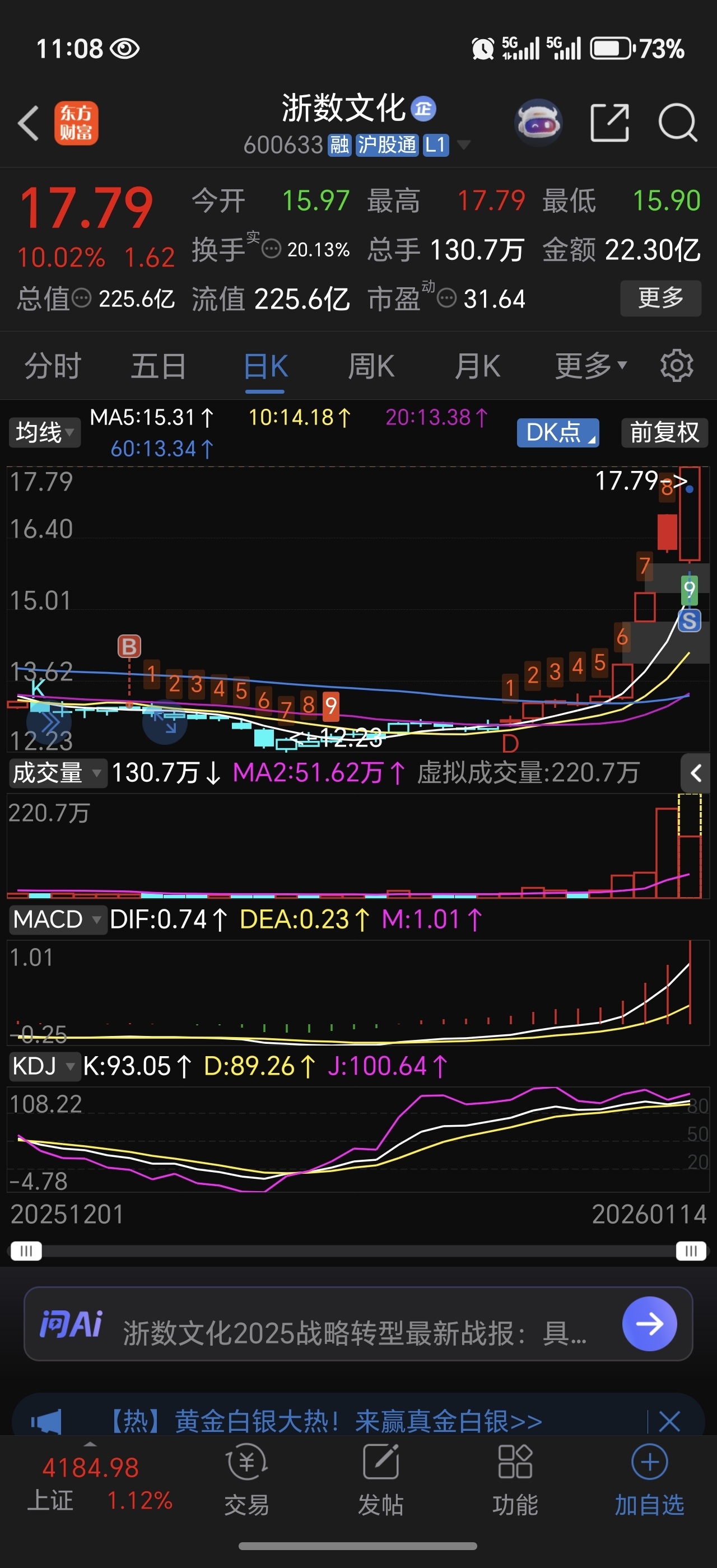 $浙数文化(SH600633)$ 祝福留下的发财,今天缩量上涨,我不贪心了,够了。