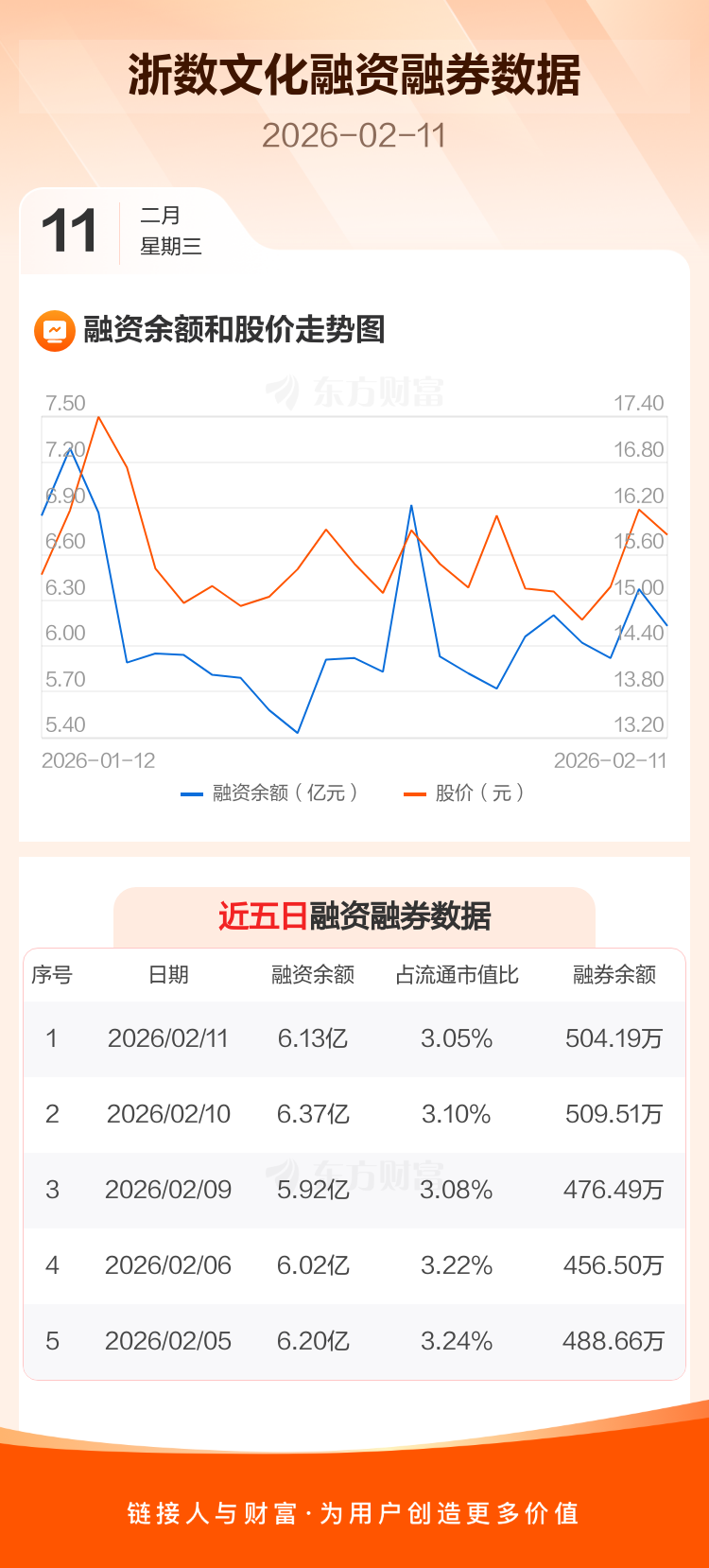 交易所最新数据显示,浙数文化于2026年2月11日获融资买入9085.28万元,融资偿还1.14亿元,当日融资净偿还2304.69万元。目前,该股融资余额6.13亿,占流通市值比例为3.05%。