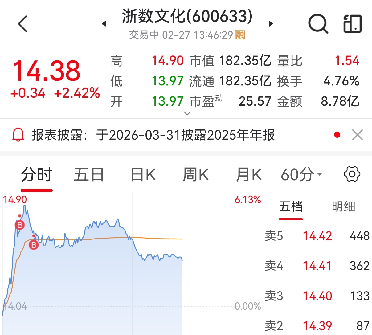 $浙数文化(SH600633)$