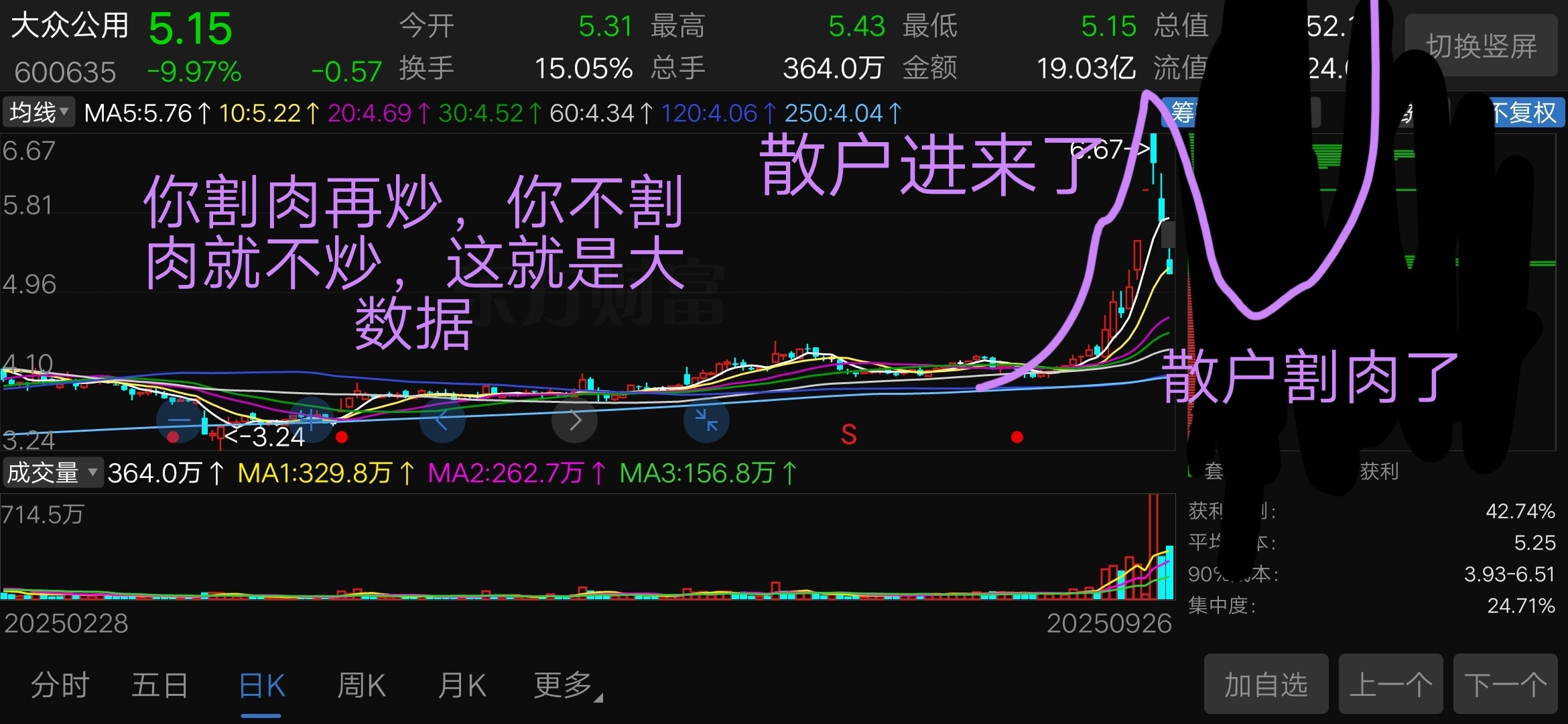$大众公用(SH600635)$ 真以为给你们送钱,你看到别的股涨5倍10倍,所以想当然而然的觉得它也能涨5倍,于是买进去于是吃套了,机构就是利用这一点放大你们人性弱点,说白了,全是量化操作市,看着你们账户操盘,没有散户参与的股才会一直涨,只要你一进入立马收哥,你以为那些游资大佬几个亿几十亿它们就能赚几倍几十倍你也能?因为它们就是庄家,它们赚的是你的钱,你们账户全都在你券商监空之中,你的每一笔交易大数据每天都被自动上传到量化系统里面自动算计,还能给你抬轿不成?