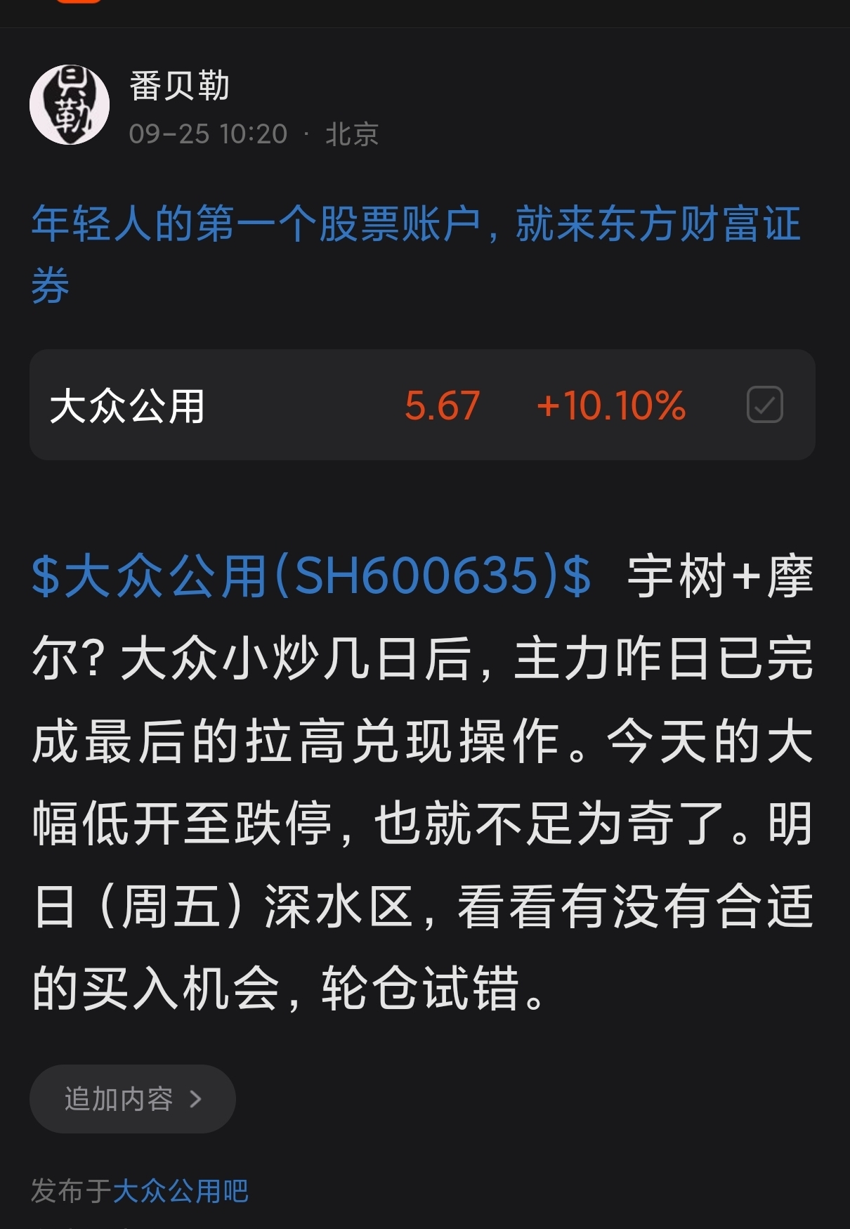 $大众公用(SH600635)$ 上周,对于大众公用,单发一帖给到了逢低入的建议。并于周四,周五进行了适当的布局。今日高开之后快速封板。而至于能否成为真正的种子选手,咱们明日再议…