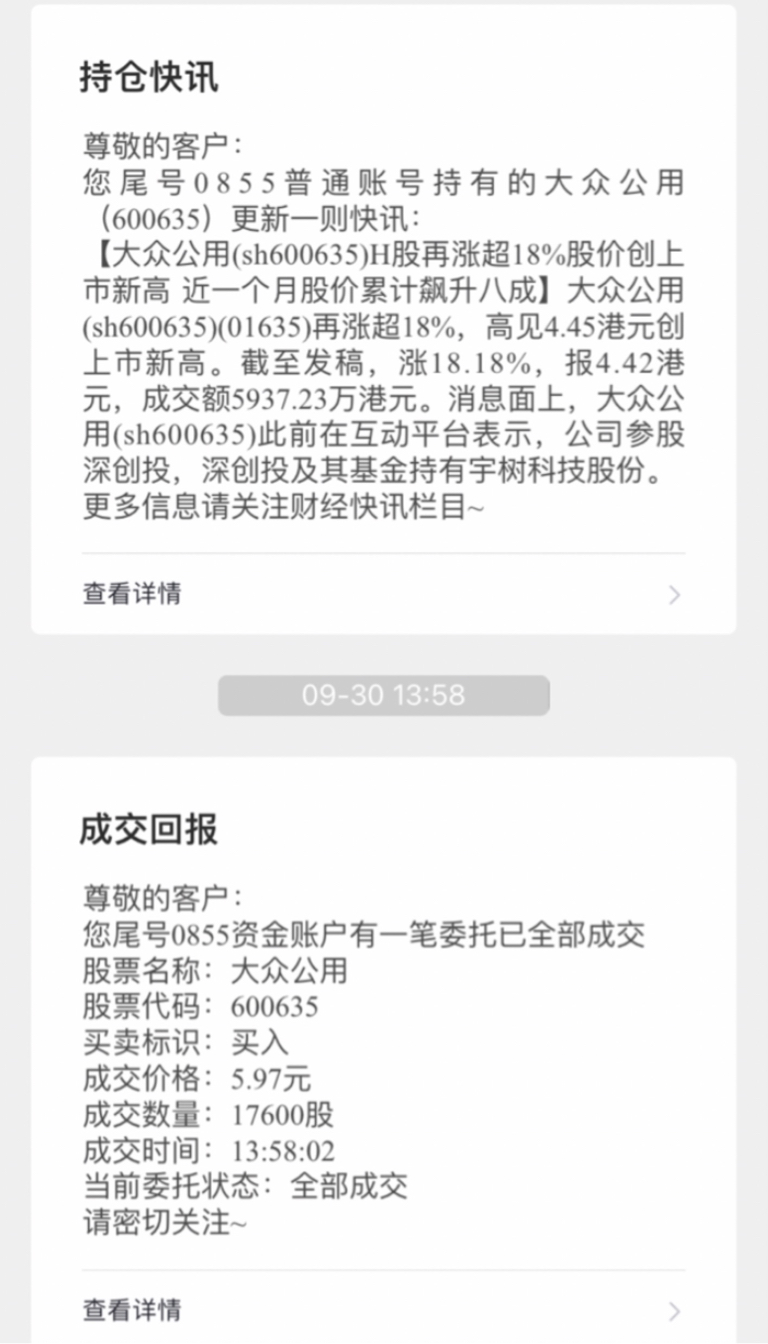 $大众公用(SH600635)$ 假期快过半了,今天还提醒我H股大涨了,可惜我没买港股通,不过那天心情好,下班前随便买了10个建了个底仓,那俺岂不是捡到了