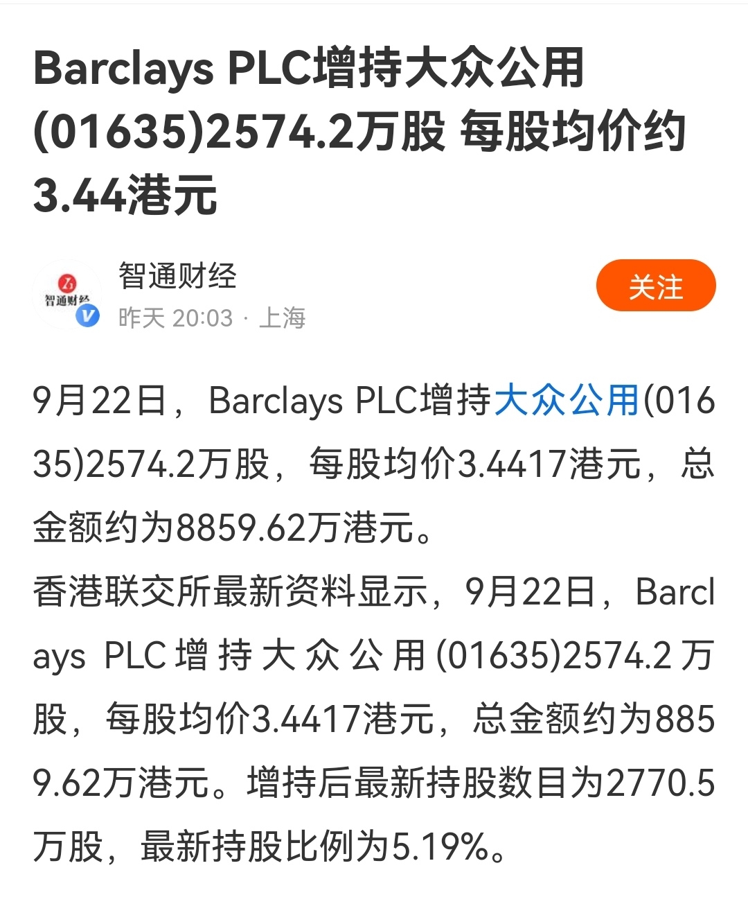 内容再多一点,外资银行举牌大众公用H股。(举牌以后,就不会随随便便卖出了:必须提前公告)