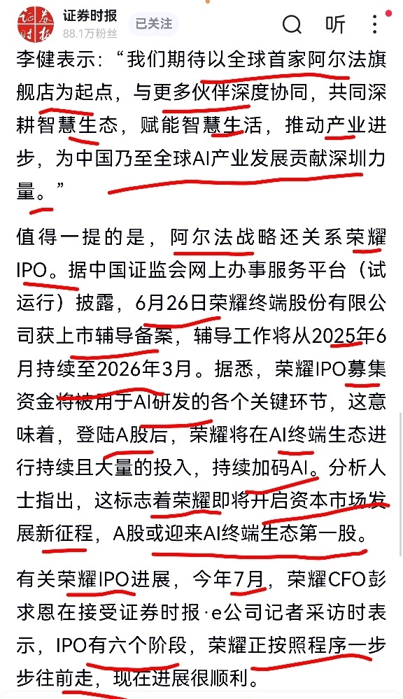 一旦IPO上市市值千亿美元起,深创投获利数百亿,大众公用七匹狼赚麻了投入超700亿进军AI终端生态,荣耀国内首发阿尔法战略!荣耀IPO上市进展很顺利!