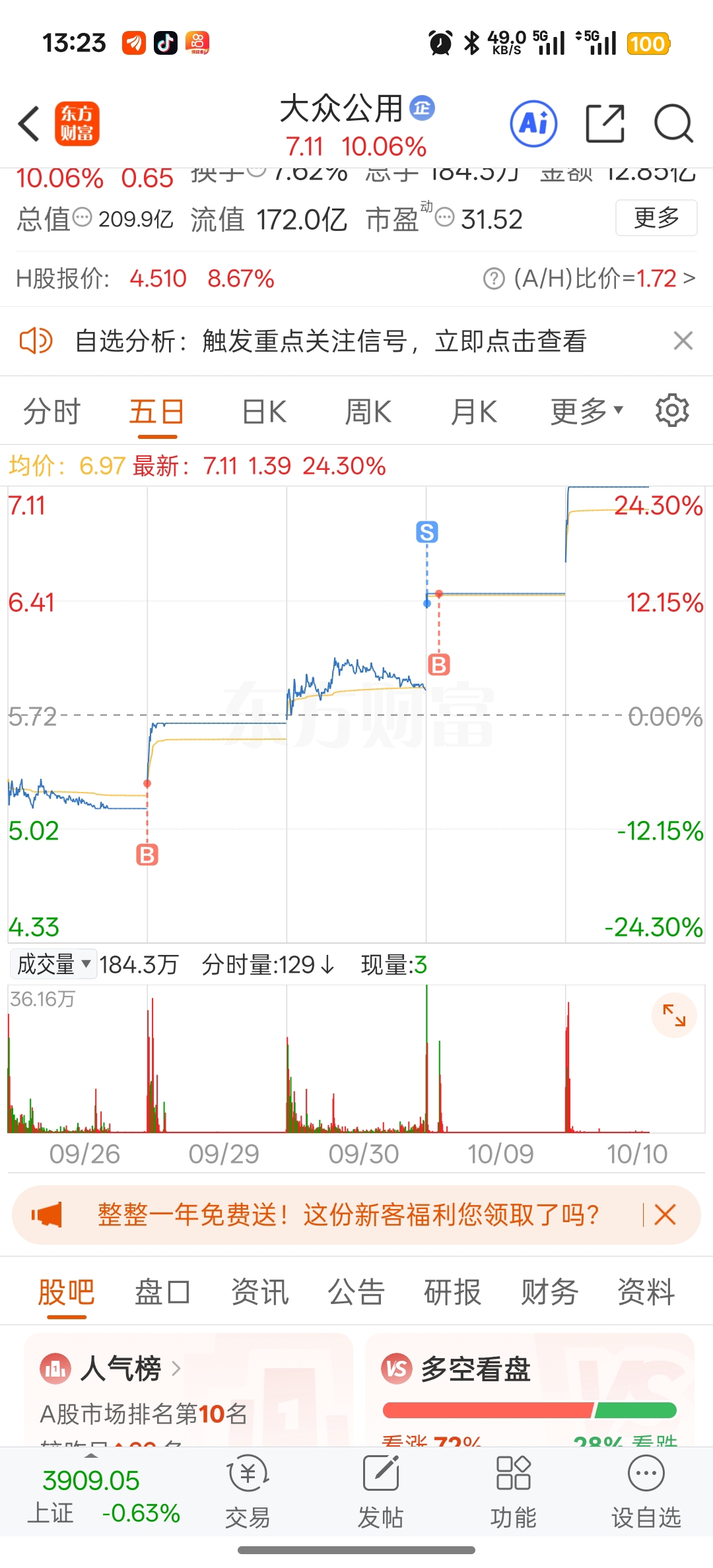 $大众公用(SH600635)$ 昨天早上开板准备补仓,谁知道突然卖保险的打一个电话过来,瞬间把买点成卖了!后面只有继续排单,谢谢主力,真是好人啊让又我买回来了!这票说实话吧,9.28那天下午研究了一下午,是准备拿几年的,可惜我的米都是借呗借的钱,接近20个点的年利率有点吃不消。