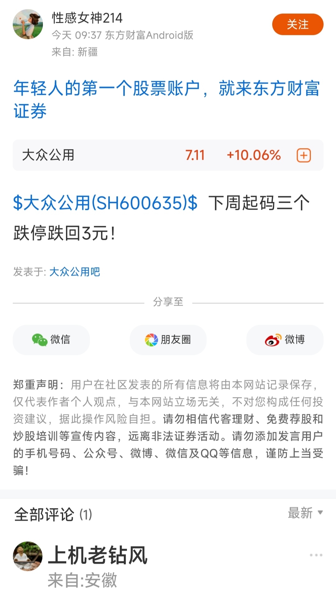 温馨提示: 1.根据《证券法》规定,禁止编造、传播虚假信息或者误导性信息,扰乱证券市场;2.用户在本社区发表的所有资料、言论等仅代表个人观点,与本网站立场无关,不对您构成任何投资建议。用户应基于自己的独立判断,自行决定证券投资并承担相应风险。《东方财富社区管理规定》