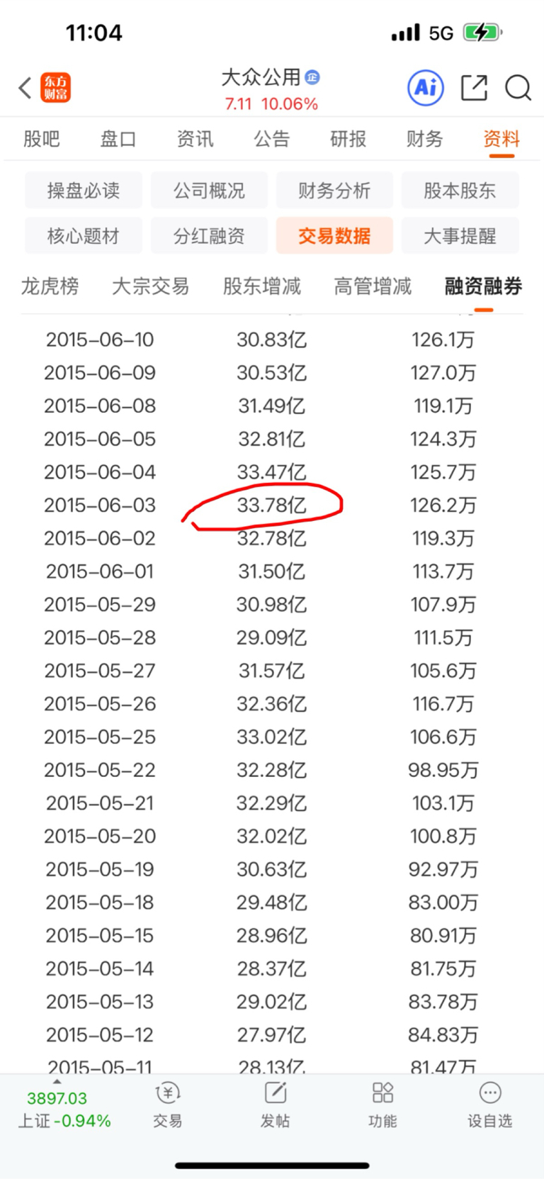 当年第一次买大众公用的时候融资余额最高的时候将近34亿,现在融资余额还远未达到历