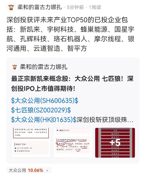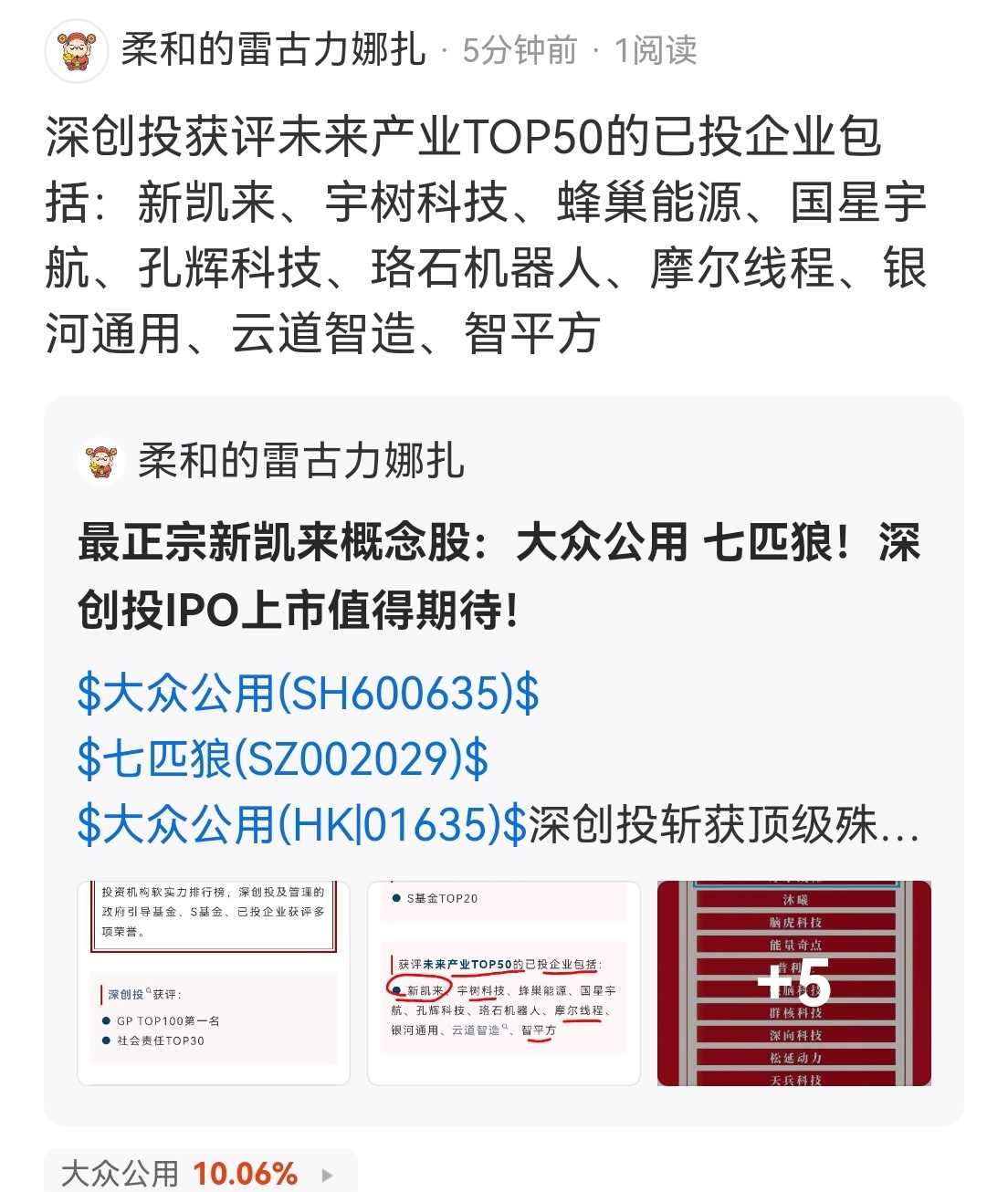 华为荣耀,凯旋归来!格局打开,新的未来! //@才情出众的沈弘苏 :最正宗新凯来概念股:大众公用,七匹狼!深创投IPO上市值得期待!//@有礼貌的圆幽乐12 :图片评论//@柔和的雷古力娜扎 :最正宗新凯来概念股:大众公用七匹狼!深创投IPO上市值得期待!柔和的雷古力娜扎24分钟前湖南居民理财资金进入股市成为历史必然,也远未结束!>大众公用7.11+10.06%七匹狼9.12+10.01%大众公用4.510+8.67%$大众公用(SH600635)$$七匹狼(SZ002029)$...