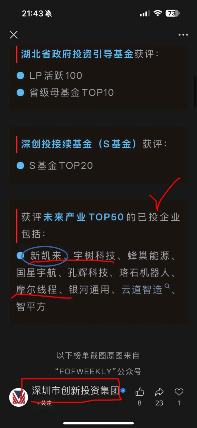 $大众公用(SH600635)$ 深创投又又要喝喜酒了。。。。新凯来成立于2021年8月,由深圳市重大产业投资集团全资控股的深芯恒科技投资有限公司注资15亿元正式成立。2025年,新凯来最新一轮融资已接近尾声,投前估值为650亿元,本轮投资由深创投、中网投、仁智资本等知名机构共同参与,但具体投资金额尚未可知。