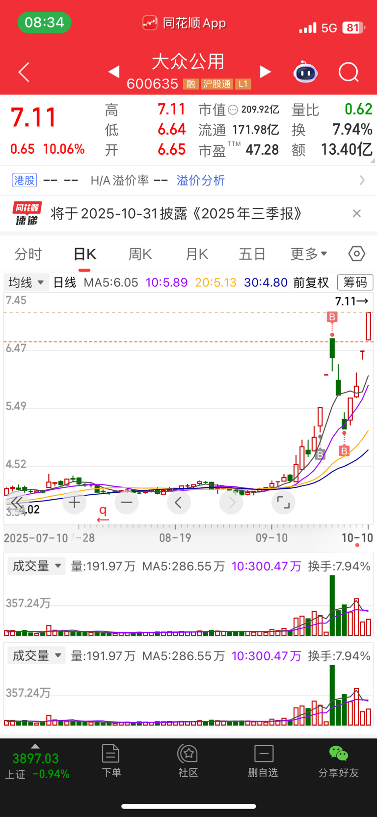 $大众公用(SH600635)$ 建仓,加仓,补仓,赌10月大涨!拿住,不做T!