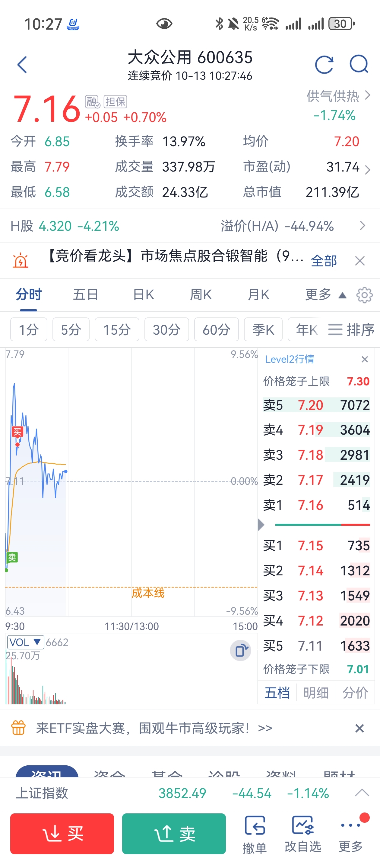 $大众公用(SH600635)$ 开盘挂跌停卖的 共三个点又接回去了三分之一仓位,这波操作谁懂啊,蠢啊