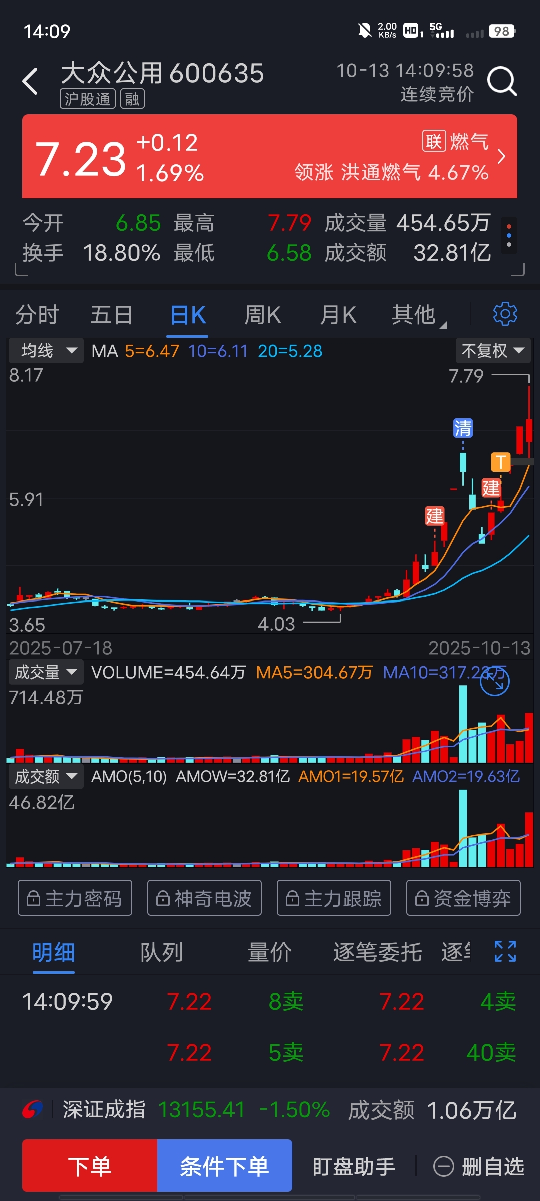 $大众公用(SH600635)$ 今天清仓,感谢大众公用,后面的我拿不住了,希望一路长虹,继续涨,看好深创投,大家发财