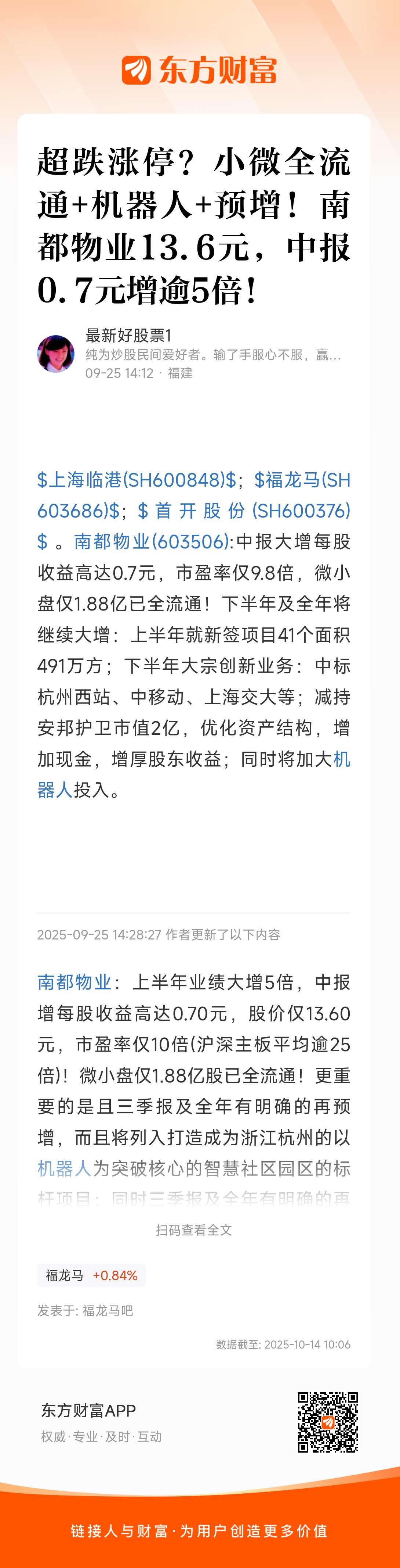 $上海临港(SH600848)$;$福龙马(SH603686)$;$首开股份(SH600376)$ 。南都物业(603506):中报大增每股收益高达0.7元,市盈率仅9.8倍,微小盘仅1.88亿已全流通!下半年及全年将继续大增:上半年就新签项目41个面积491万方;下半年大宗创新业务:中标杭州西站、中移动、上海交大等;减持安邦护卫市值2亿,优化资产结构,增加现金,增厚股东收益;同时将加大机器人投入。