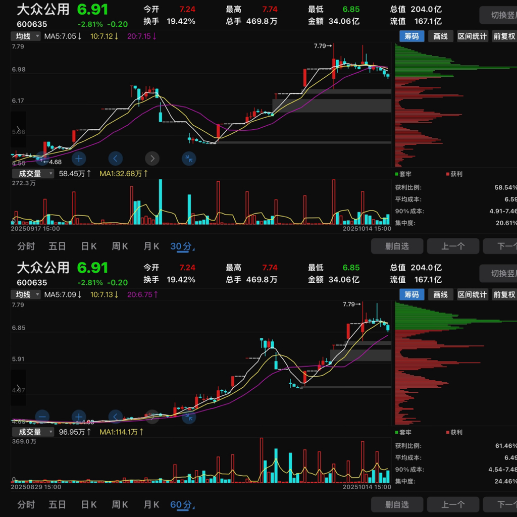 $大众公用(SH600635)$ 30和60分时图来看,主力还在,洗盘的嫌疑更大,看好的就拿着,不看好的就走,主力够良心了,每天买卖自由
