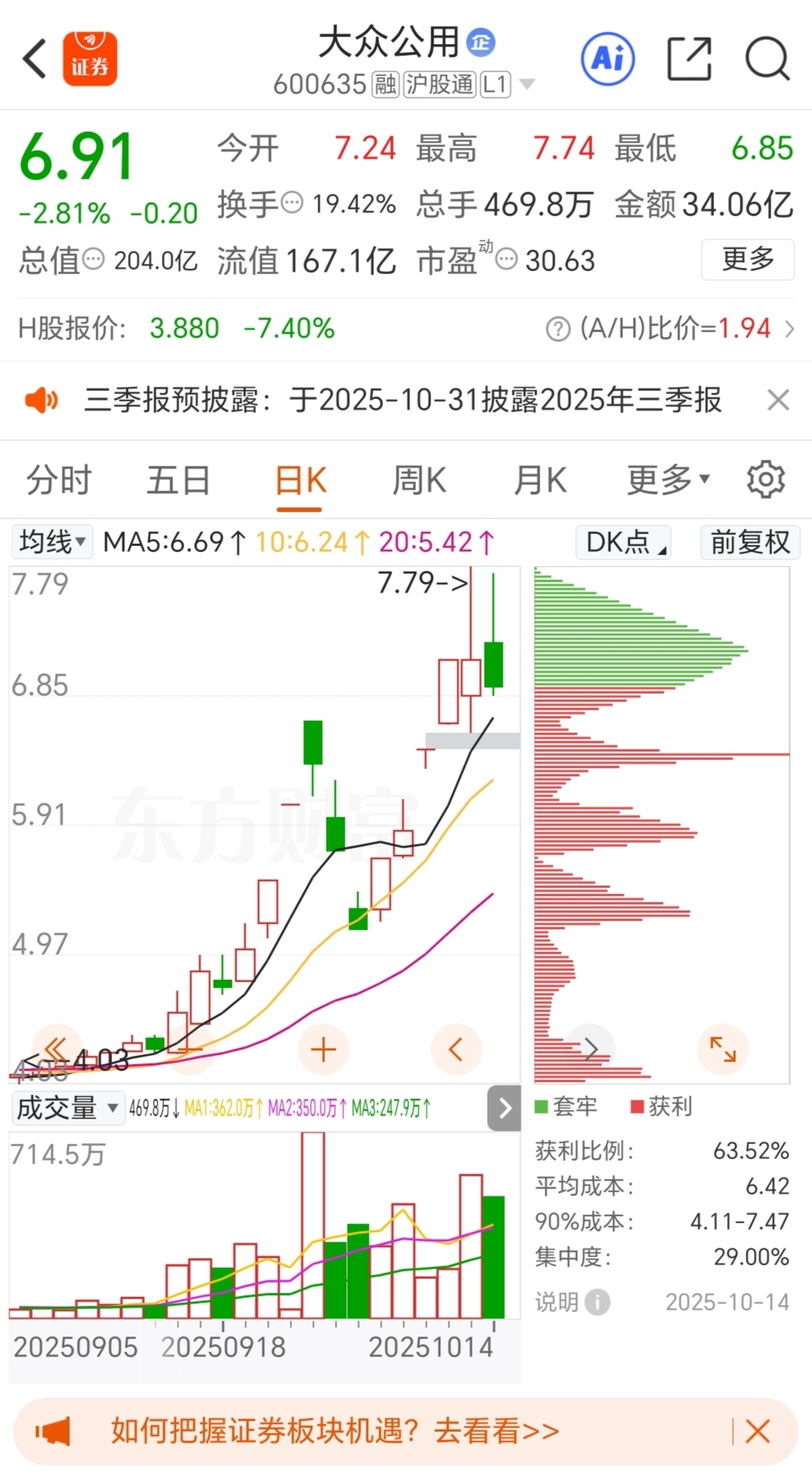 $大众公用(SH600635)$ 国庆后最近4个交易日底部筹码峰基本再无变动,存量还尚且坚实,这两天资金出逃是短期获利盘了结+避险资金动量交化,今天未见一条万手顶格绿大单,可见主力无主动砸盘之嫌,两条长影线,到底是测试上方抛压还是日内洗盘,充分交换筹码,任由进出自如?明天很关键,已准天量,再搞条避雷针,股价向下,恐阶段性顶部将到来,进入调整阶段。
