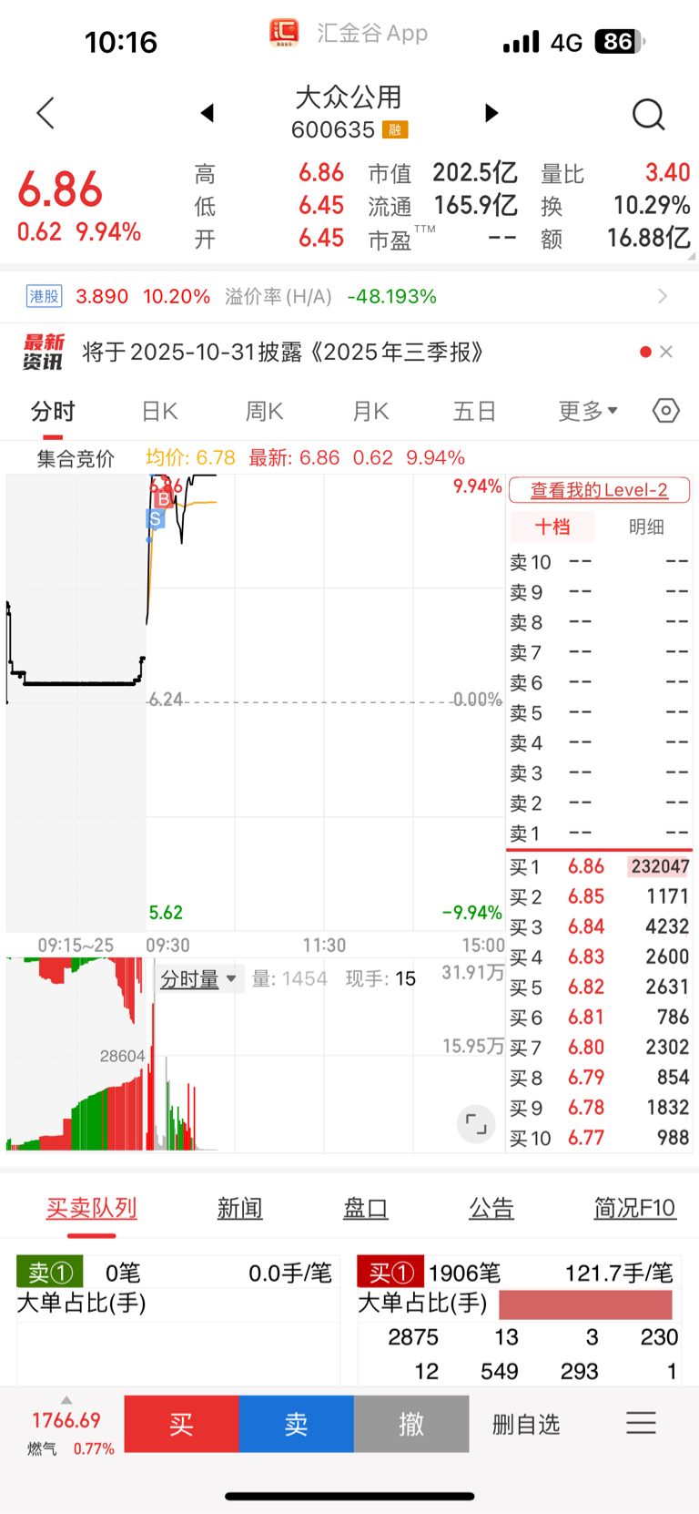$大众公用(SH600635)$ 本想做T,自作聪明把自己T飞了,涨停位置左右又抢了点回来,这操作就一S B