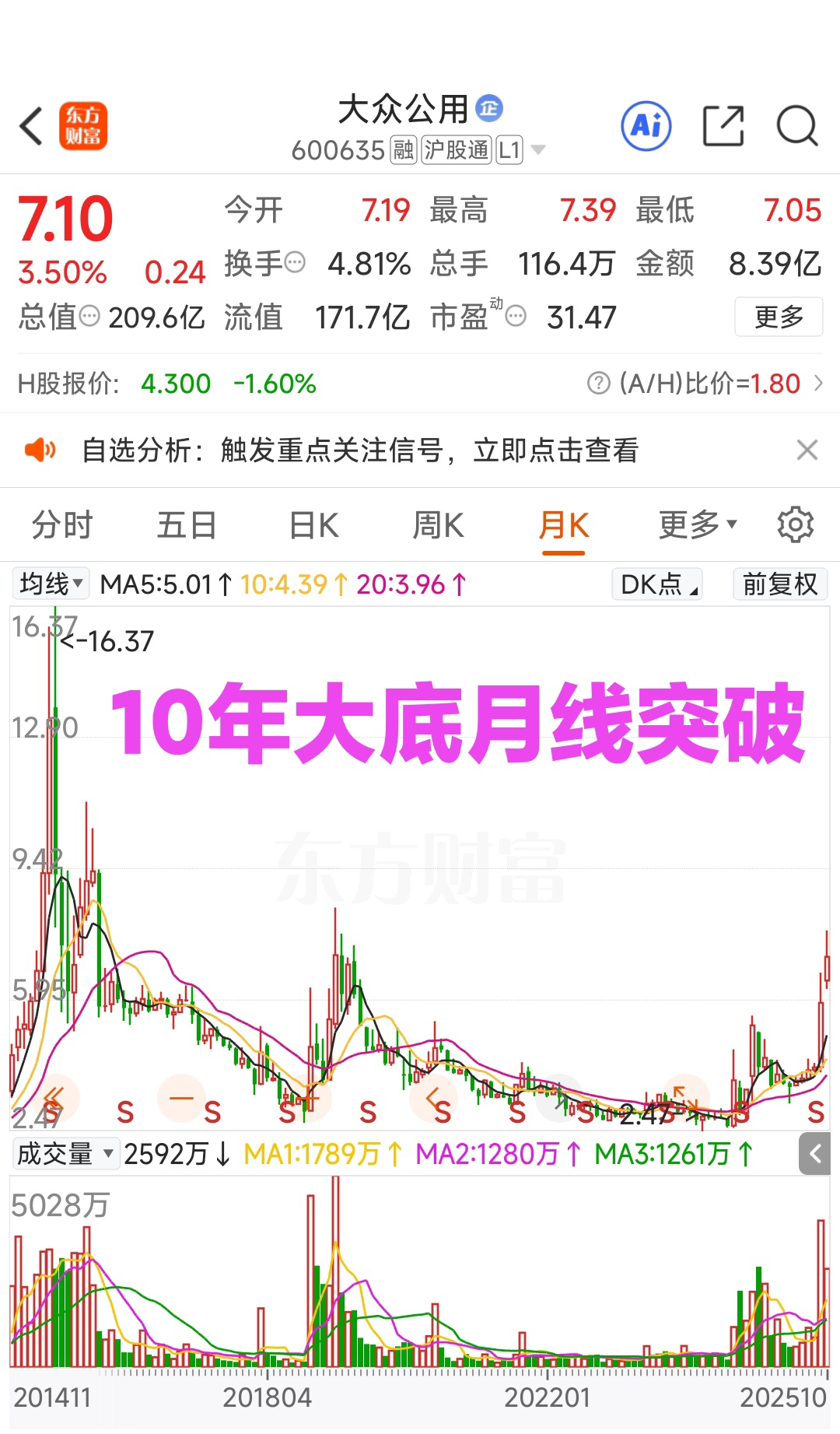 $大众公用(SH600635)$ 沐㬢+摩尔+宇树+中芯+本源量子+天然气+充电桩,持有深创投10.8%股权,大众公用董事长杨国平任深创投副董事长,10年大底月线突破,中报净利润3.33亿元增172.6%,每股收益0.11元