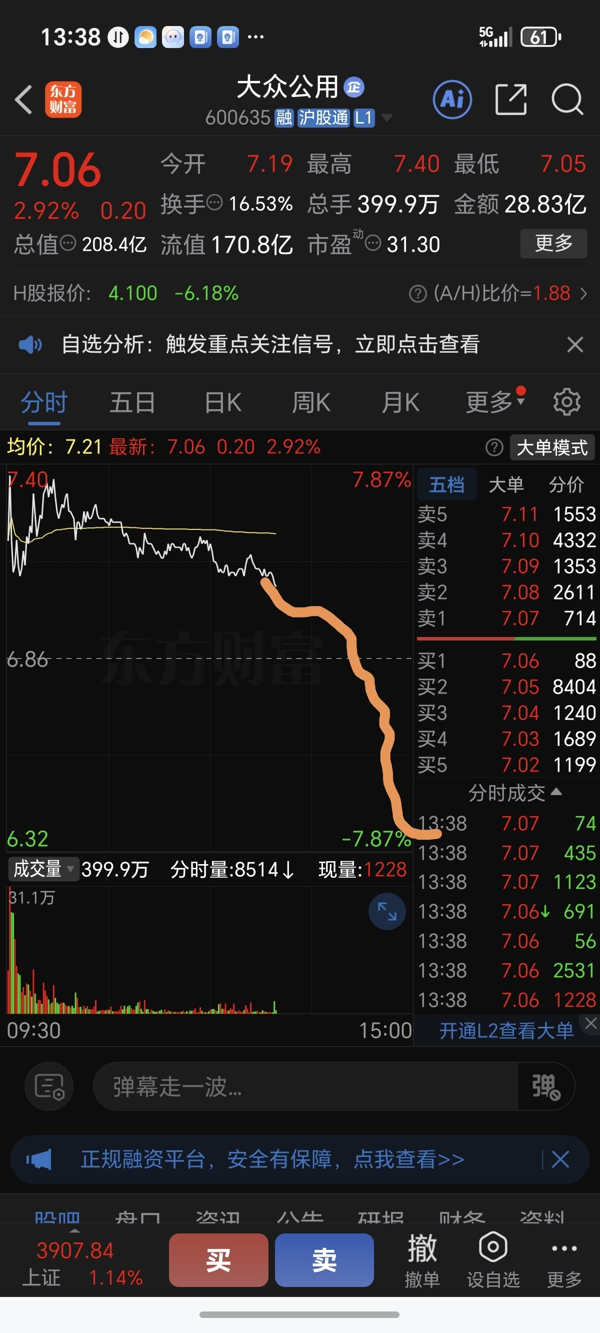 $大众公用(SH600635)$ 今天的走势图,百分百准确