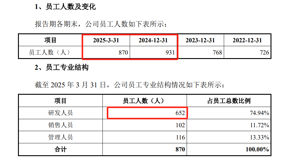 截至2025年3月末,公司员工总数870人,相较2024年末的931人,减少了61人。其中,研发人员是缩减大头,从706人降至652人,减少了54人。恰逢IPO关键时期,对一家技术密集型企业而言,研发人员的缩减无疑是一个不利信号。研发人员是公司技术创新和产品升级的核心力量,人员缩减可能导致公司研发能力下降,影响公司的长期发展。