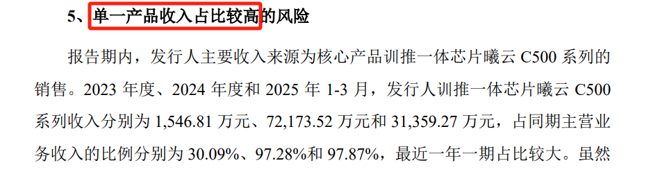 沐曦股份的业务结构还存在明显隐患——营收高度依赖单一产品。2024年及2025年一季度,曦云C500系列收入分别占主营业务收入的97.28%和97.87%,成为公司营收的绝对支柱。这种单一的业务结构使得公司在市场变化和竞争加剧时缺乏灵活性,难以通过多元化业务分散风险。一旦该产品市场出现波动或被竞争对手超越,公司的营收和利润将面临大幅下滑的风险。