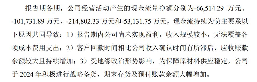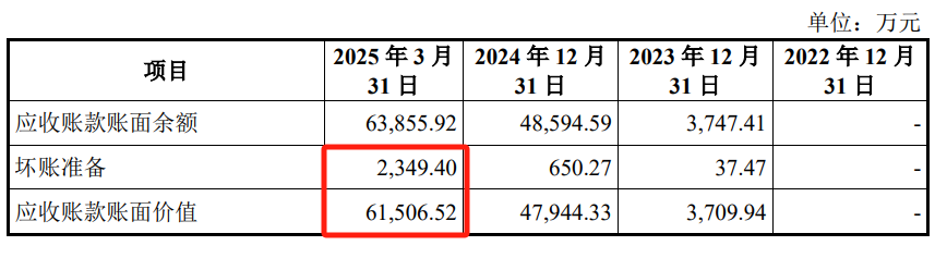连年亏损使得公司现金流持续承压,各期经营性现金流净额分别为 -6.65 亿元、-10.17 亿元、-21.48 亿元和 -5.31 亿元,累计净流出43.61亿元。更令人担忧的是,其应收账款急剧膨胀,2025年一季度应收账款账面价值高达 6.15 亿元,占当期营收比例达 191.96%,远超行业正常水平。这种状况不仅加剧了公司的资金周转压力,也增加了坏账风险。