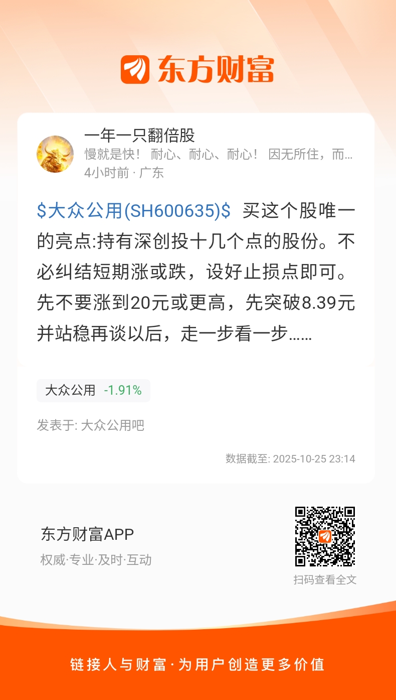 $大众公用(SH600635)$ 买这个股唯一的亮点:持有深创投十几个点的股份。不必纠结短期涨或跌,设好止损点即可。先不要涨到20元或更高,先突破8.39元并站稳再谈以后,走一步看一步……