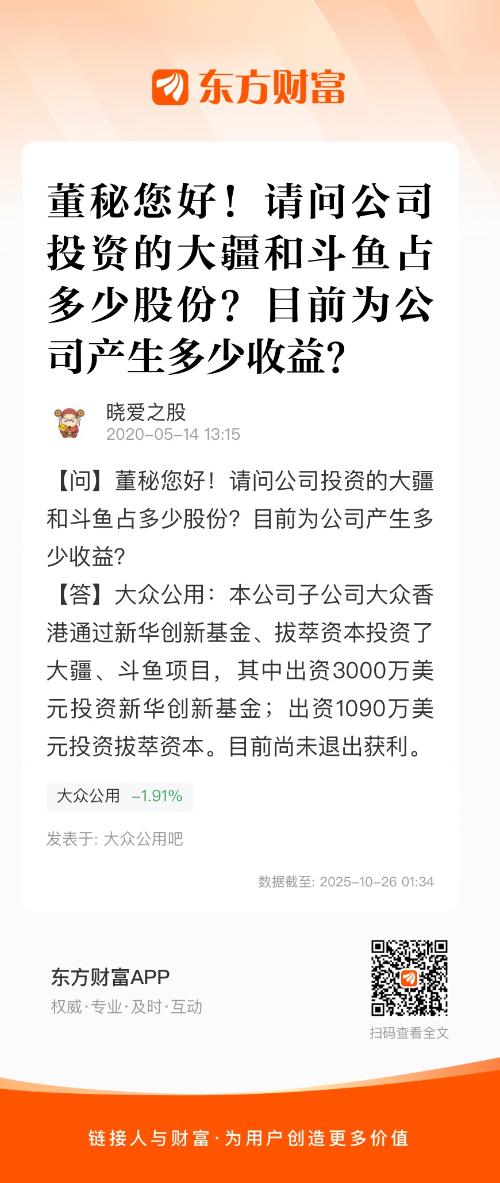 董秘您好!请问公司投资的大疆和斗鱼占多少股份?目前为公司产生多少收益?