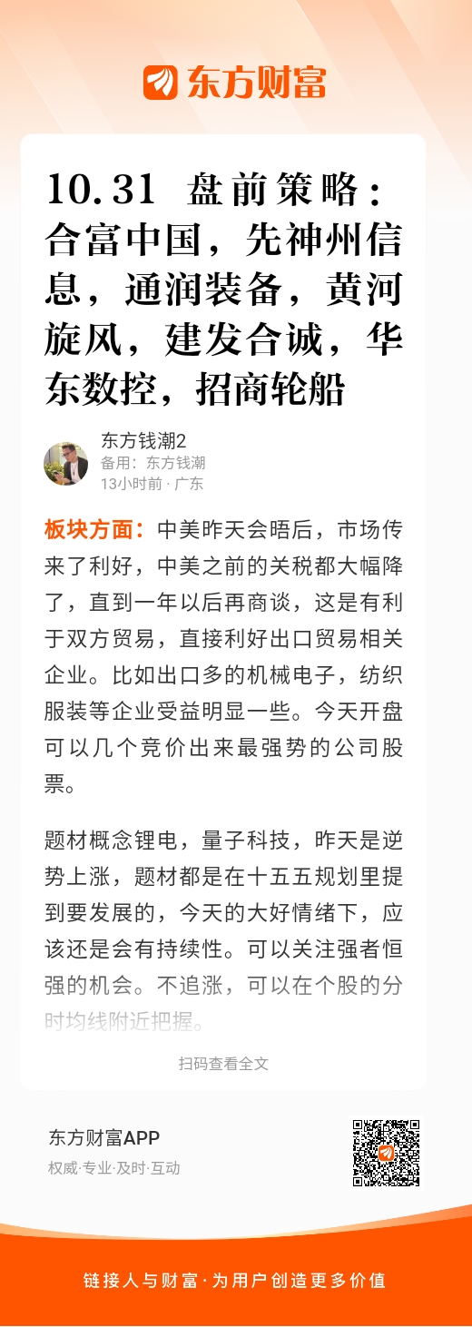 华东数控(002248):股价是突破震荡区间的走势,要是今天股价继续高开,就有望走出强势的上升趋势,高开就要重点关注,盘中出现了放量站上分时均线就可以考虑入场。有望走出连板的行情。$华东数控(SZ002248)$