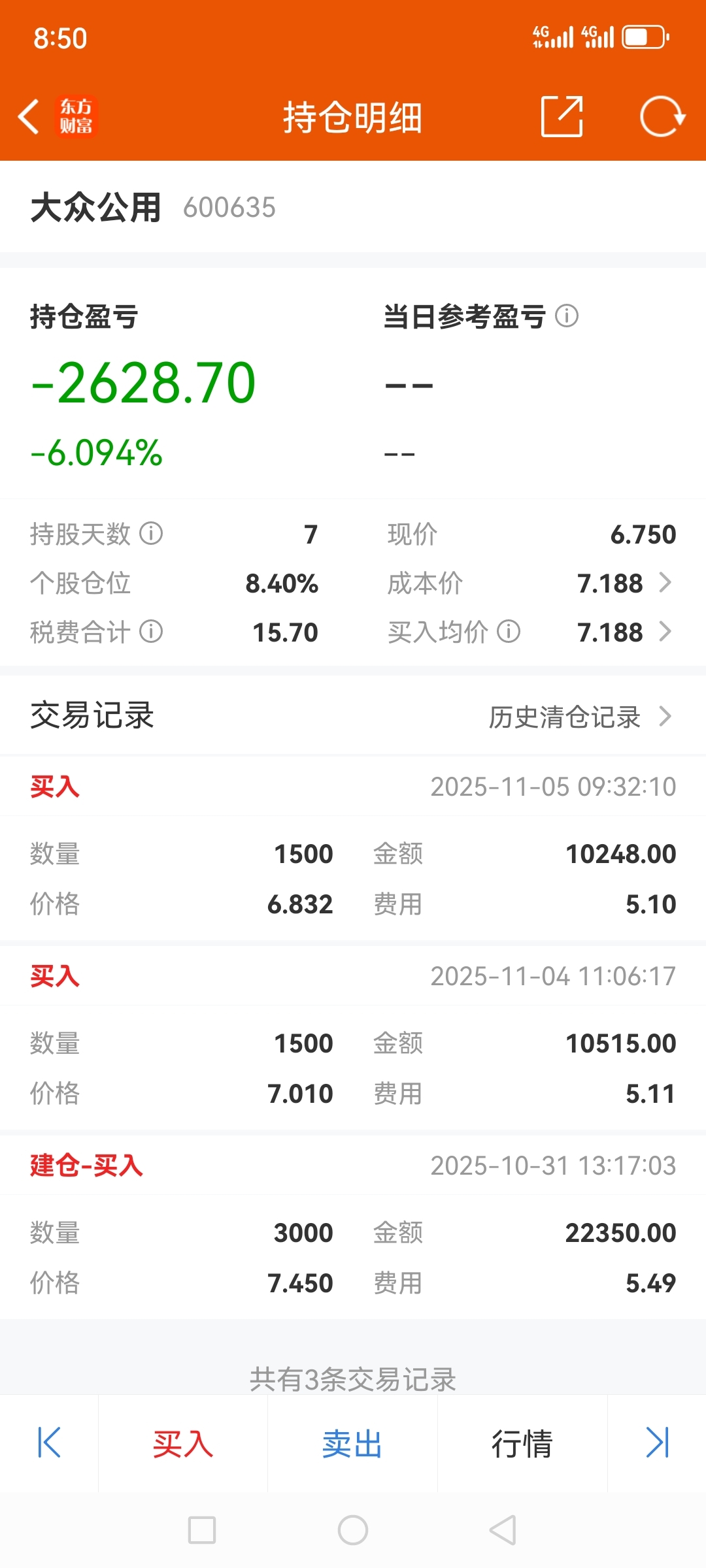 $大众公用(SH600635)$ 每跌5毛买进3千股,6.5元排了几天不给进,今天应该没问题了吧