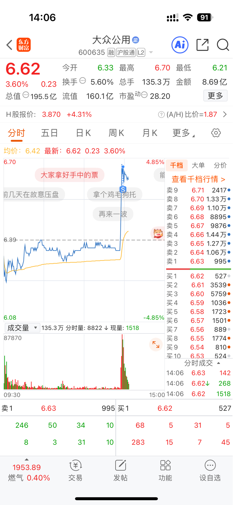 $大众公用(SH600635)$ 感谢主力早盘挂的6.39没把我吃了,本来还想着亏9千认输,结果还赚了6千。
