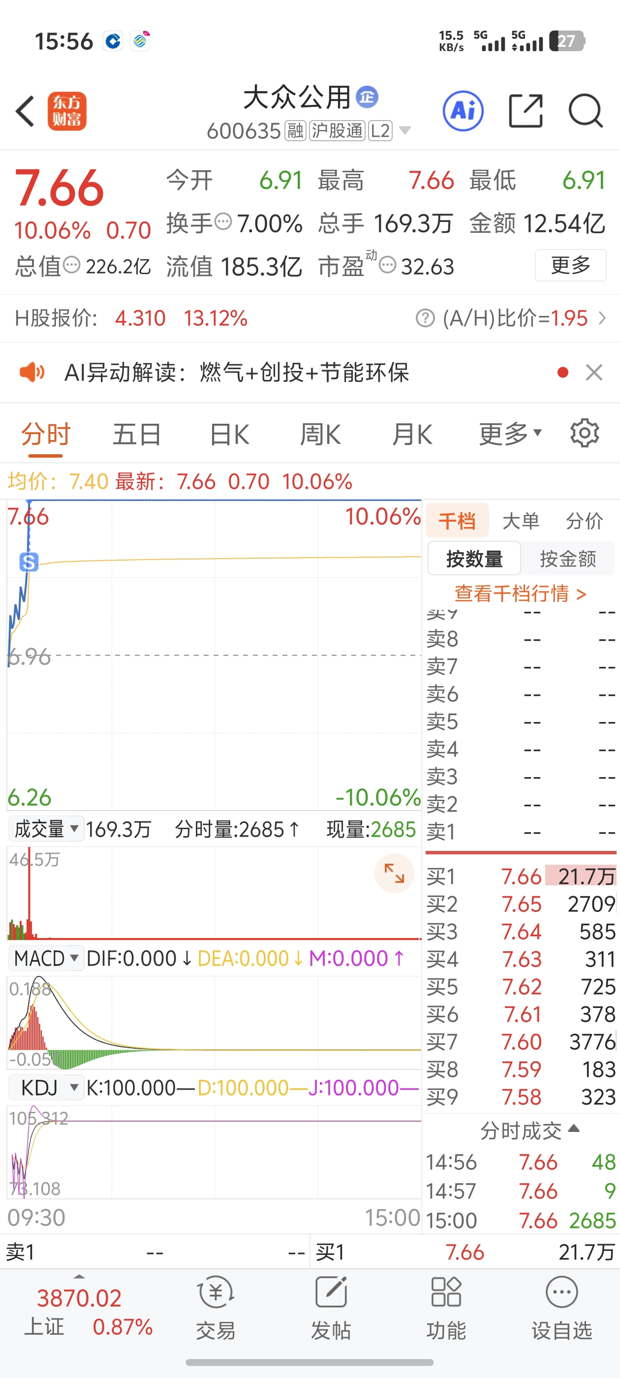 $大众公用(SH600635)$ 今天不错