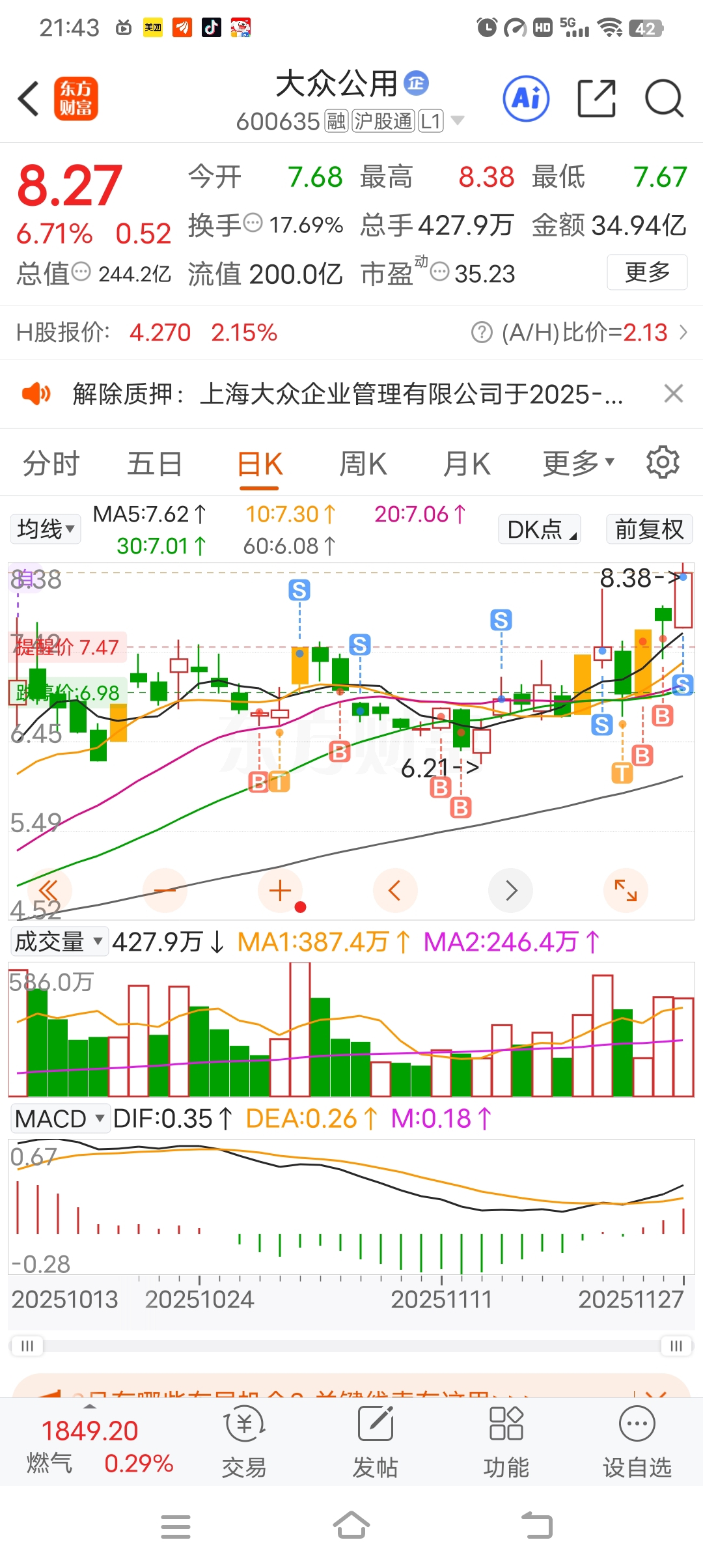 $大众公用(SH600635)$ 玩了1个月,今天清仓先走了,各位道友,有缘再见