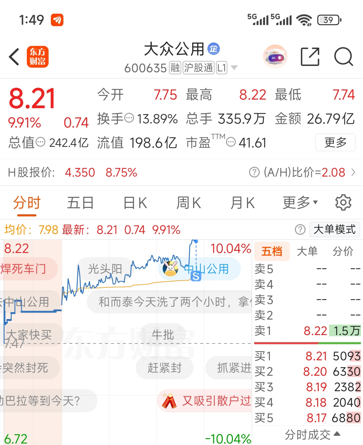 $大众公用(SH600635)$ 走了 我不贪心吃个涨停板够了