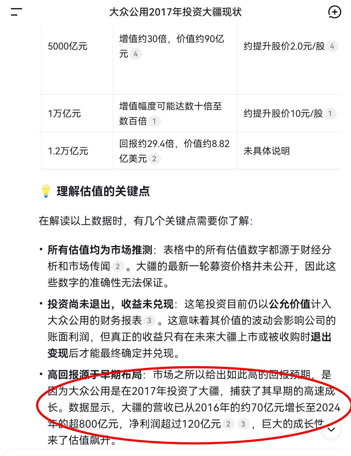 高回报源于早期布局:市场之所以给出如此高的回报预期,是因为大众公用是在2017年投资了大疆,捕获了其早期的高速成长。数据显示,大疆的营收已从2016年的约70亿元增长至2024年的超800亿元,净利润超过120亿元,巨大的成长性带来了估值飙升。