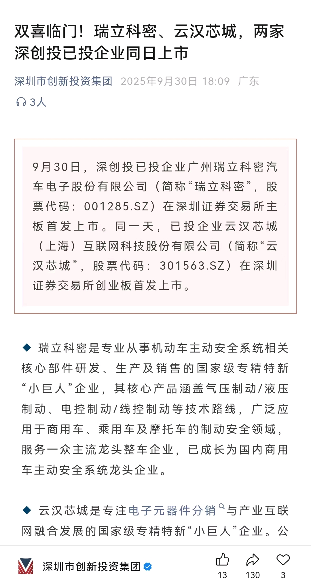$大众公用(SH600635)$ 9月30日,大众公用深创投双喜临门:瑞立科密和云汉芯城双双上市。