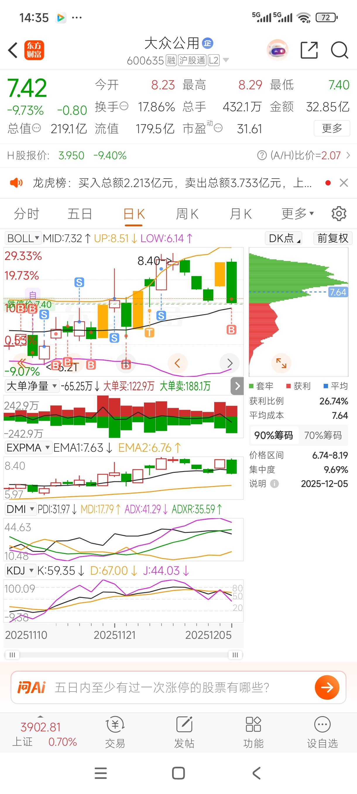 $大众公用(SH600635)$ 上次建仓6.82 盘中做T后成本做到6.36 上周8.16清仓,周五7.46继续建仓,周一周二观察二天再决定后期要不要继续做