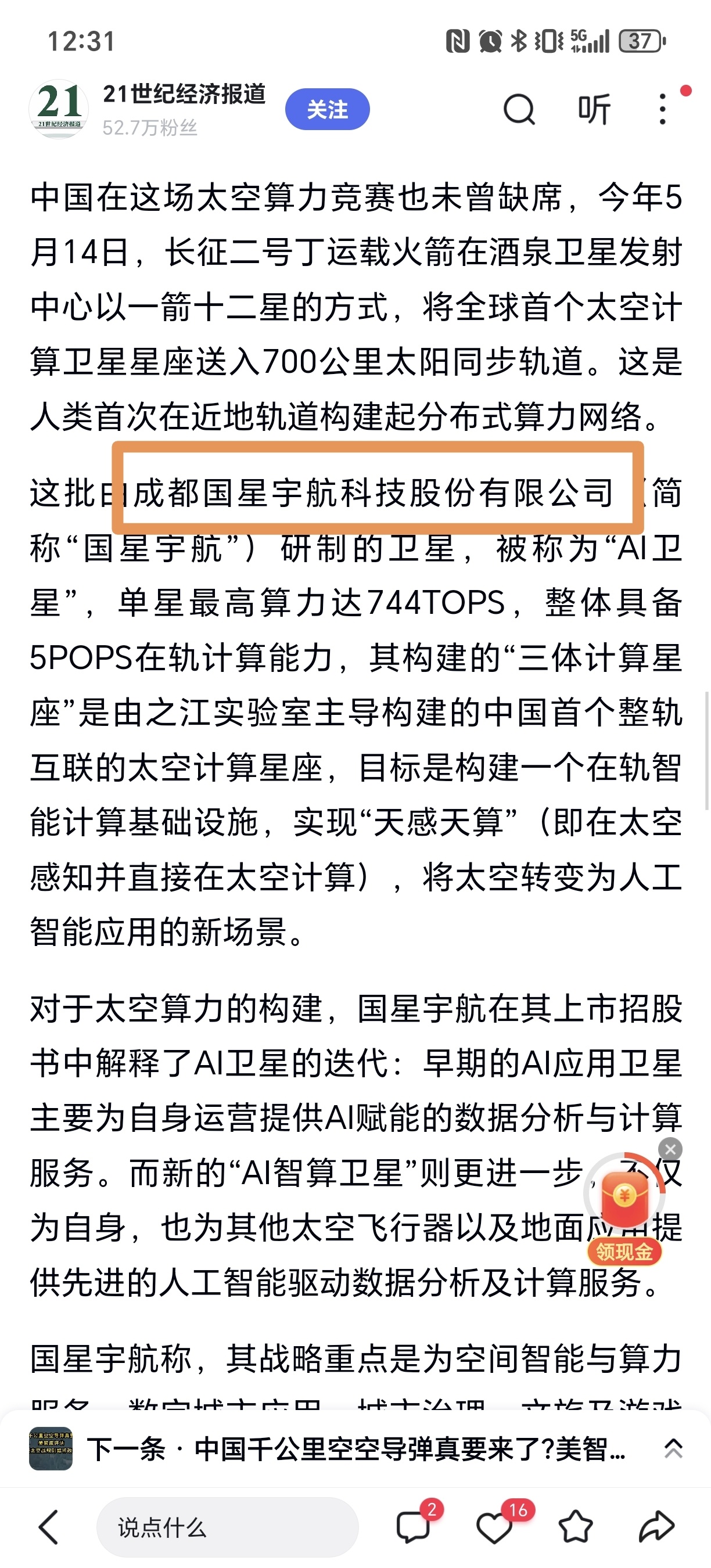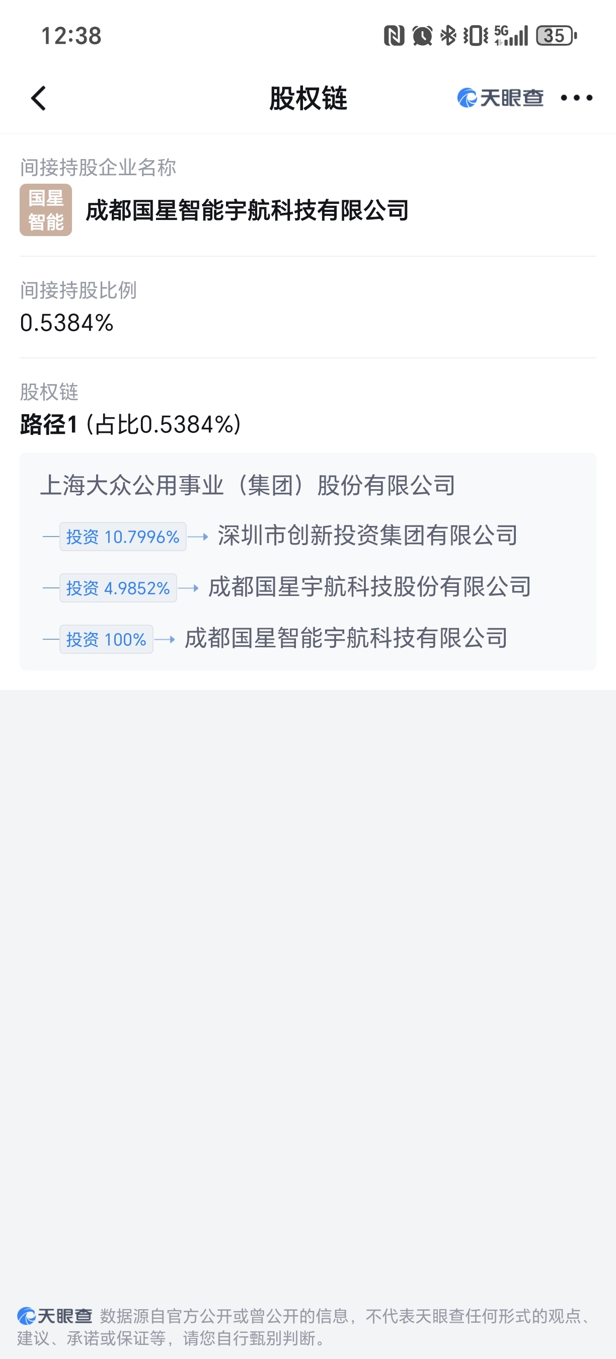 $大众公用(SH600635)$ 大众公用间接持有30-40家航空航天公司,尤其是持有0.5384%的成都国星智能宇航科技股份有限公司,是新闻里拿来作为中国案例,与SPACEX来对比的商业航天公司。