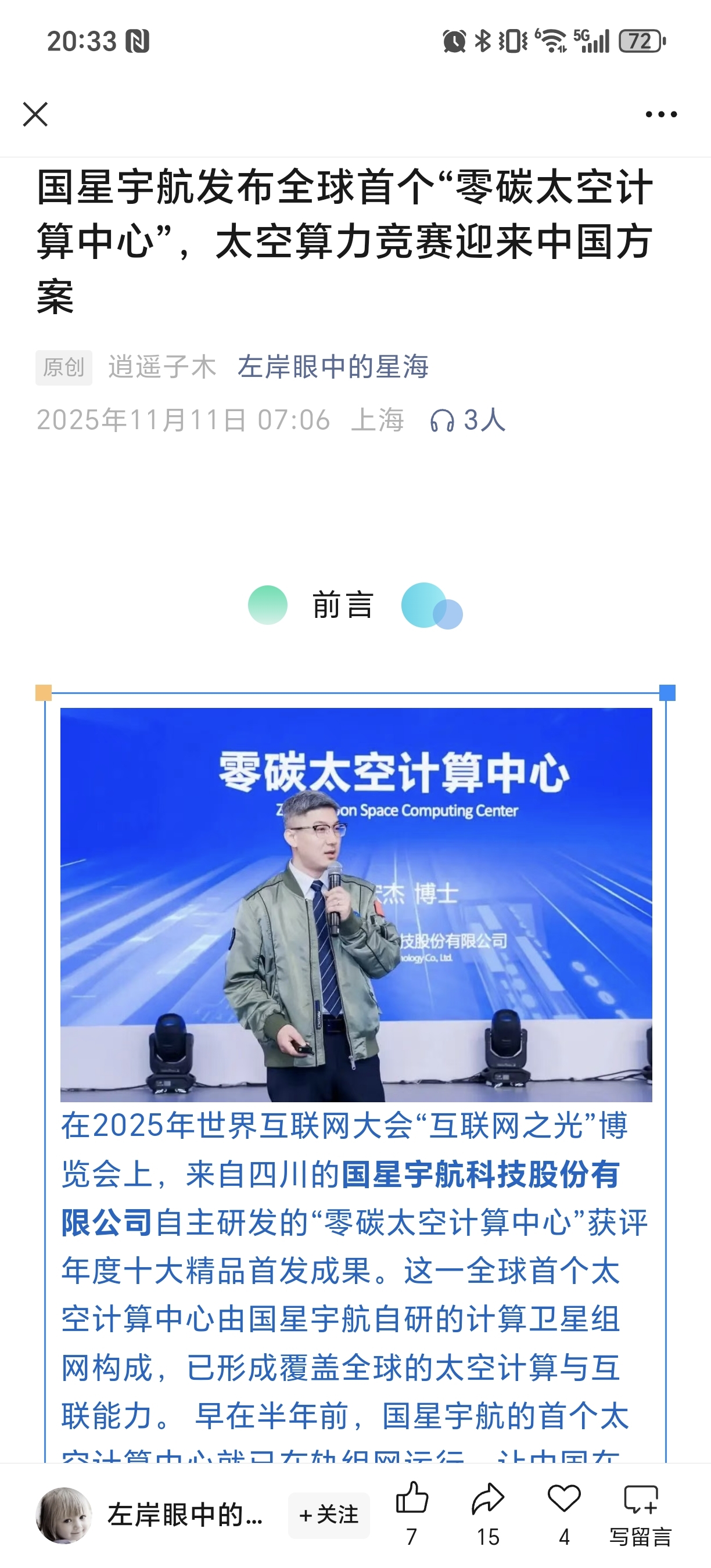 $大众公用(SH600635)$ 国星宇航发布全球首个“零碳太空计算中心”,太空算力竞赛迎来中国方案