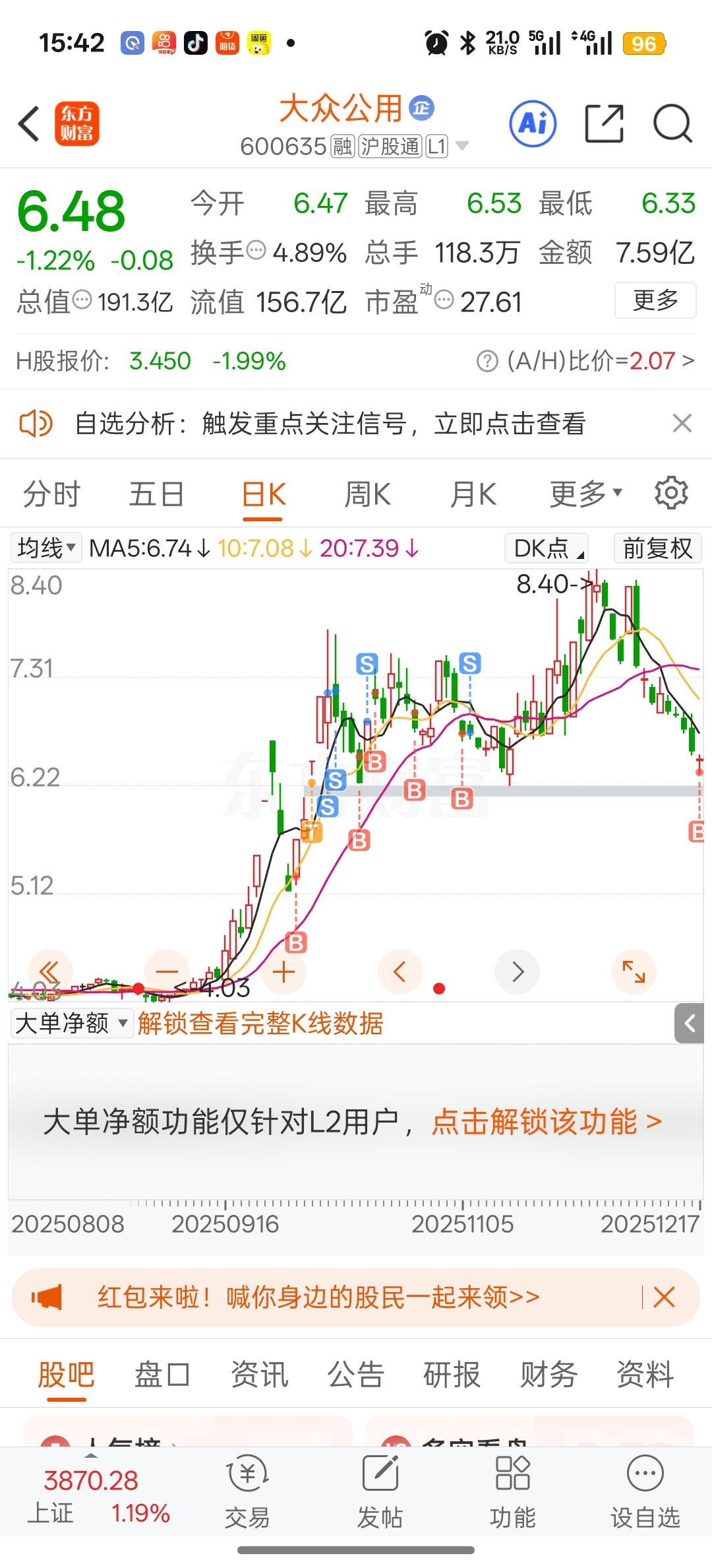 $大众公用(SH600635)$ 好票无需多言!今年亏的都在这儿回来的,漂哥和bing哥不知道你俩还有没有在这个吧里,那会儿别人都说跌,只有你两个死多头唱多我才拿住了30多个点的利润!价格合适了你俩能回来吗