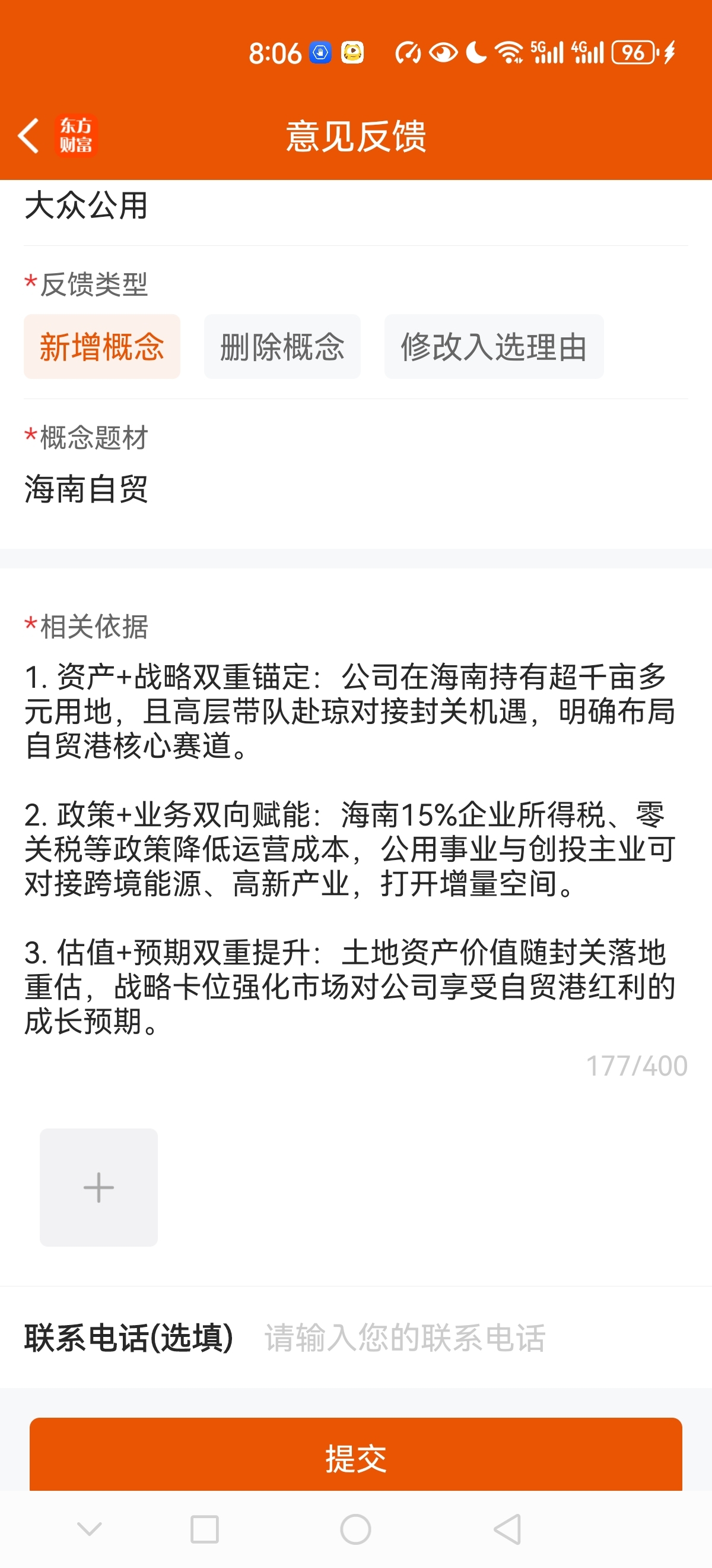 已申请增加“海南自贸”概念!等待东方财富的反馈意见!