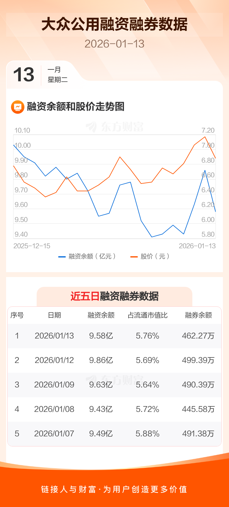 交易所最新数据显示,大众公用于2026年1月13日获融资买入9620.33万元,融资偿还1.25亿元,当日融资净偿还2838.64万元。目前,该股融资余额9.58亿,占流通市值比例为5.76%。