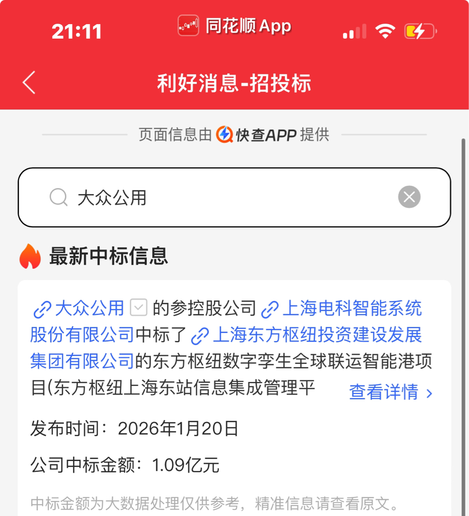 $大众公用(SH600635)$ 这么大的利好你们都不看吗!子公司中标一个亿的项目!