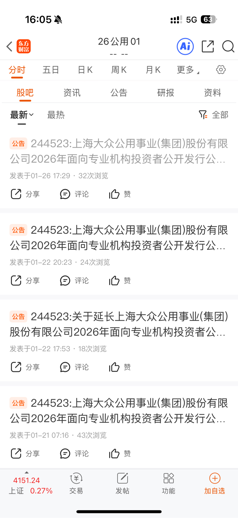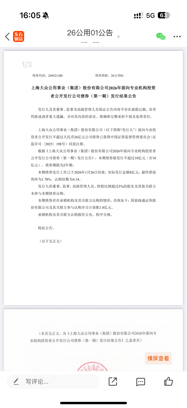$大众公用(SH600635)$ 2026年1月26日发行8亿公司债 首期,1.78利息。这个公司既然敢不公告在平台上! 所有的都给你们发了