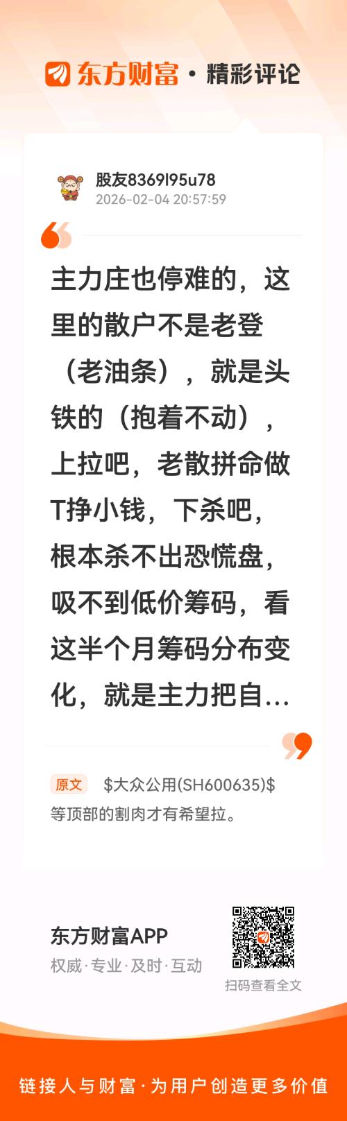 //@股友8369l95u78 :主力庄也停难的,这里的散户不是老登(老油条),就是头铁的(抱着不动),上拉吧,老散拼命做T挣小钱,下杀吧,根本杀不出恐慌盘,吸不到低价筹码,看这半个月筹码分布变化,就是主力把自己筹码上下移动…慢慢的主力只能慢慢撤离,缓慢的阴跌