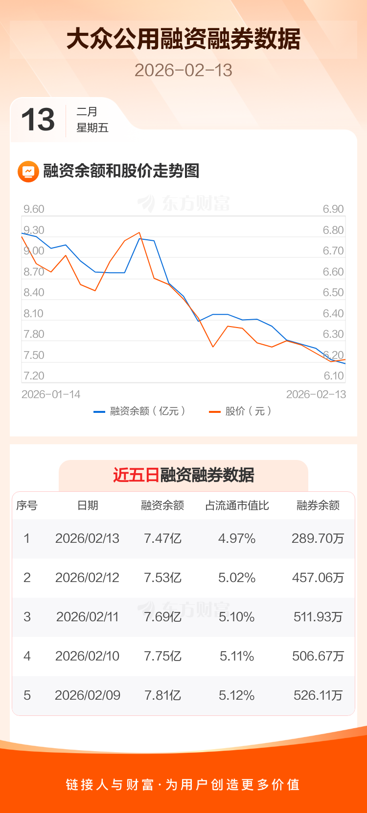 交易所最新数据显示,大众公用于2026年2月13日获融资买入1684.33万元,融资偿还2353.29万元,当日融资净偿还668.96万元。目前,该股融资余额7.47亿,占流通市值比例为4.97%。